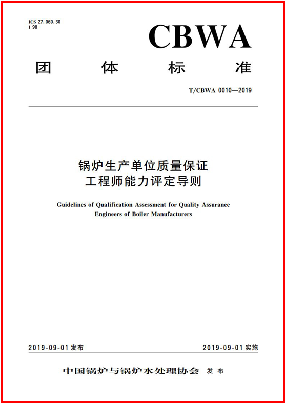 9月1日,由中(zhōng)國鍋爐(lú)與鍋爐水處理協會主導(dǎo)設計,由香蕉视频91鍋爐有限公司參與製定的T/CBWA 0010-2019 《鍋爐生產單位質量保證工程師能力評定(dìng)導則》正式發(fā)布(bù)。